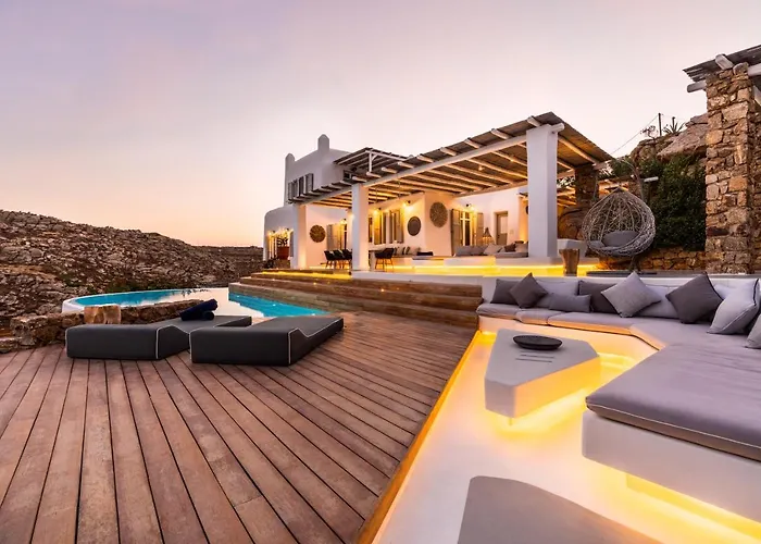 Located about 6 km from Elia Nude Beach, the 6-room Villa Artisti Mykonos provides a private swimming pool for guests' relaxation. This 7-bedroom villa overlooks the Aegean Sea and arranges horse riding tours for active travellers.